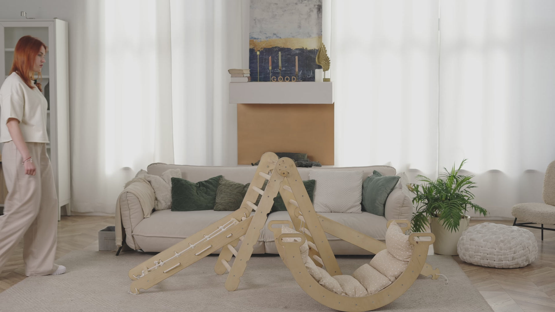 5-in-1 Montessori-Klimrek Set: Driehoek Ladder + Klimboog/Schommelstoel + Glijbaan/Helling + Touwennet + Kussen