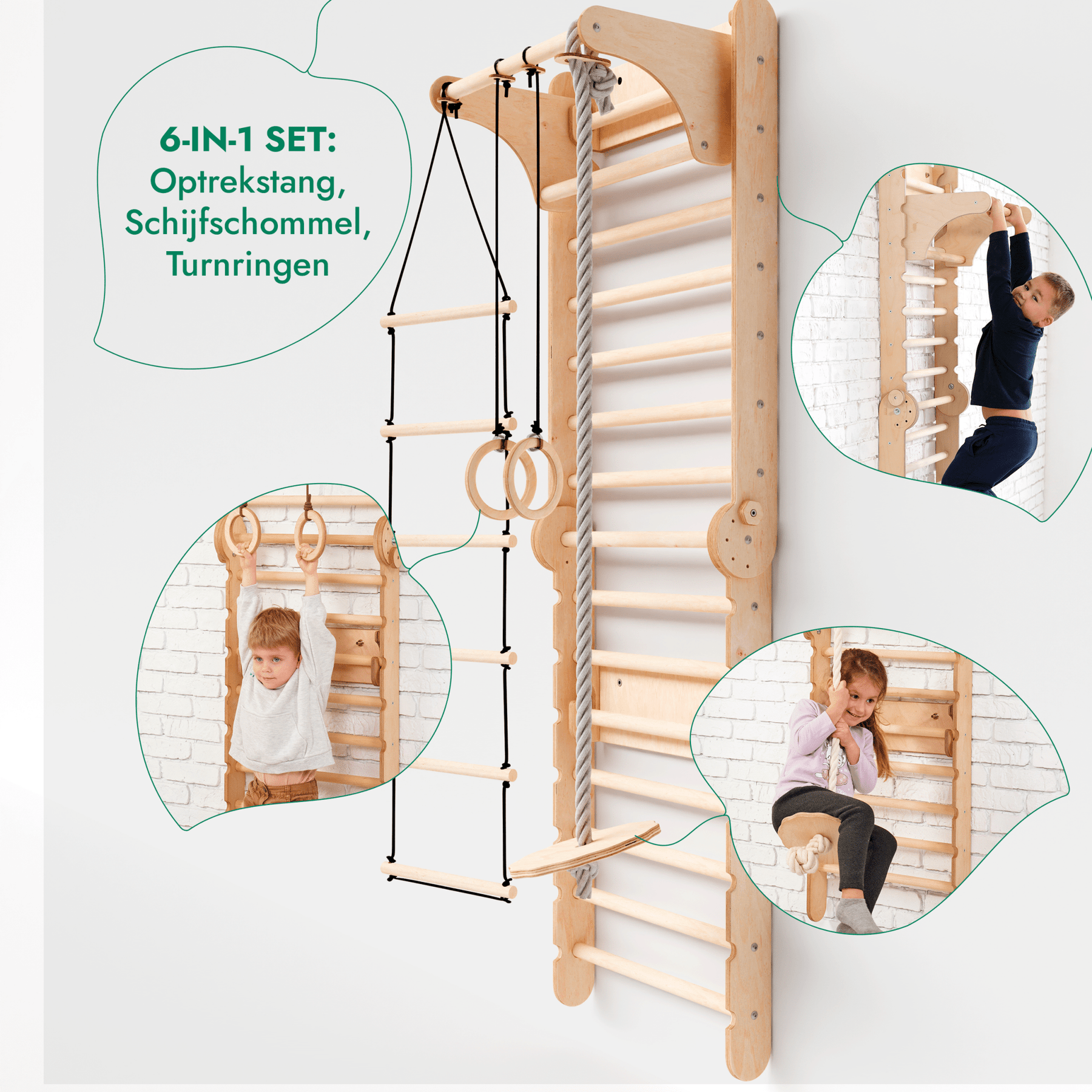 6-in-1 Houten Zweedse Wand-/Klimladder voor Kinderen + Schommel Set + Glijbaan