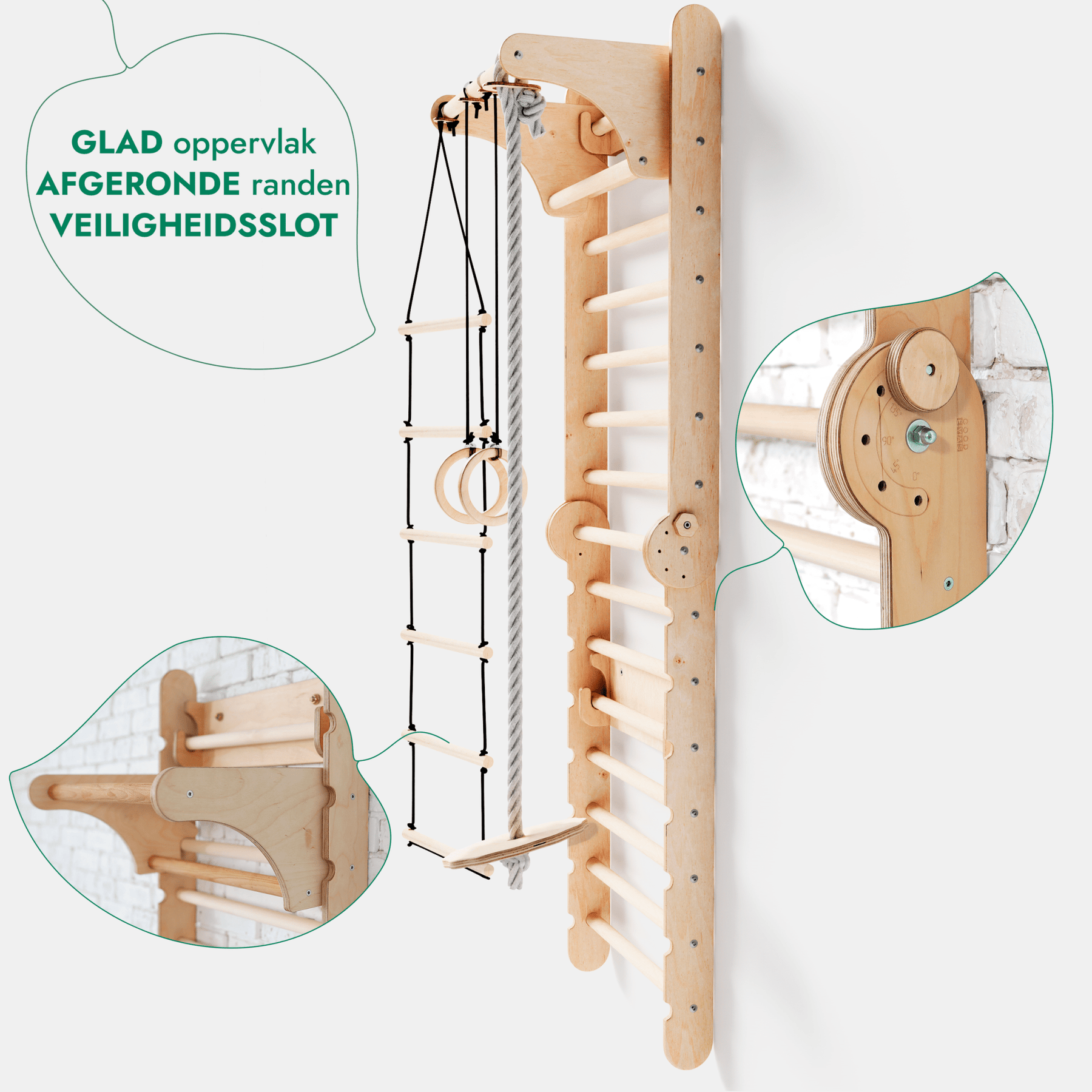 Het veelzijdige ontwerp maakt het mogelijk om de wand eenvoudig om te vormen tot een Pikler-driehoek met glijbaan, wat nog meer mogelijkheden voor beweging en spel biedt. De set bevat ook drie verschillende schommels voor extra variatie en plezier. De Goodevas Zweedse wand is meer dan alleen spelen — het gaat om ontwikkeling, veiligheid en blijvende kwaliteit.