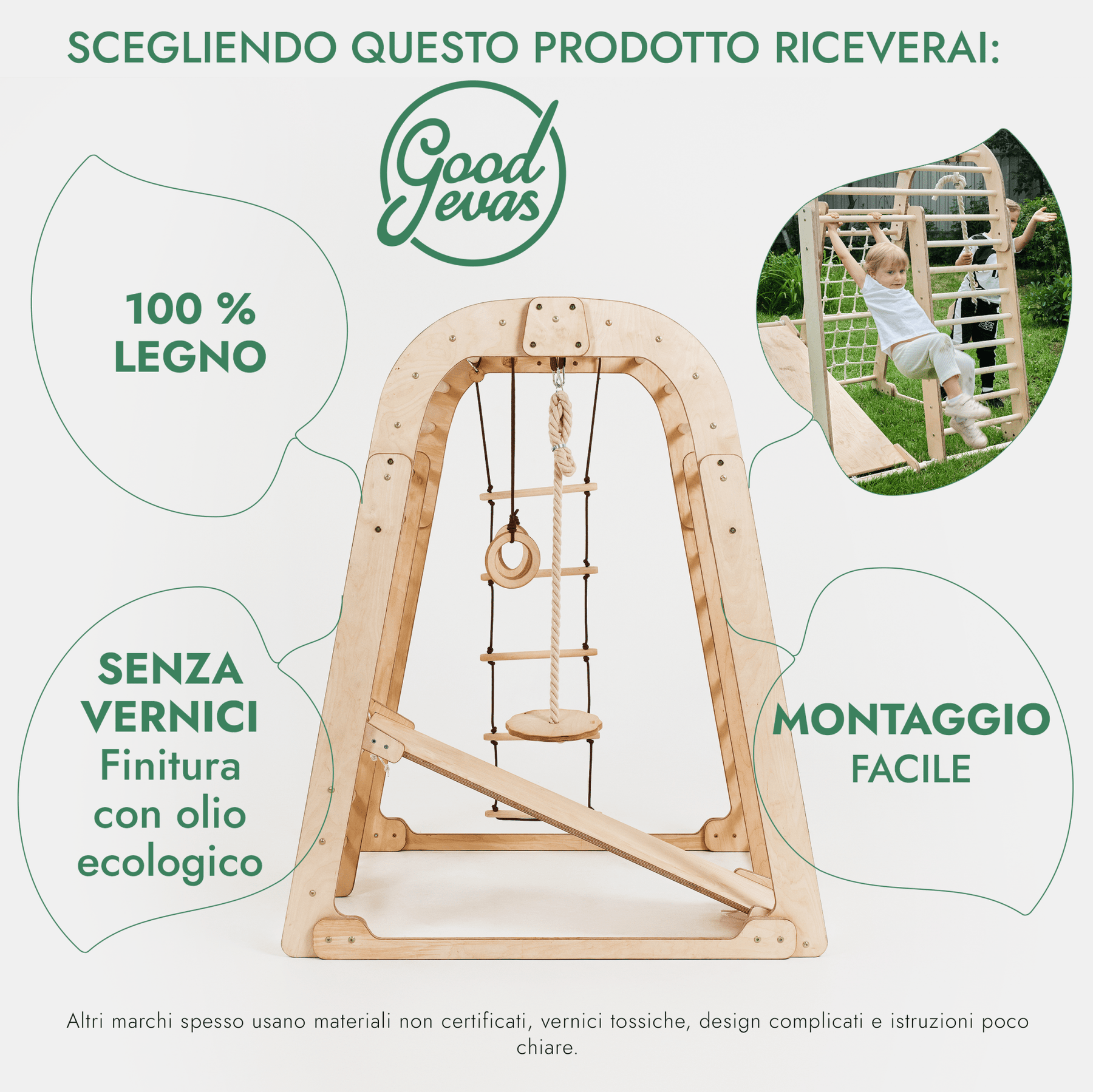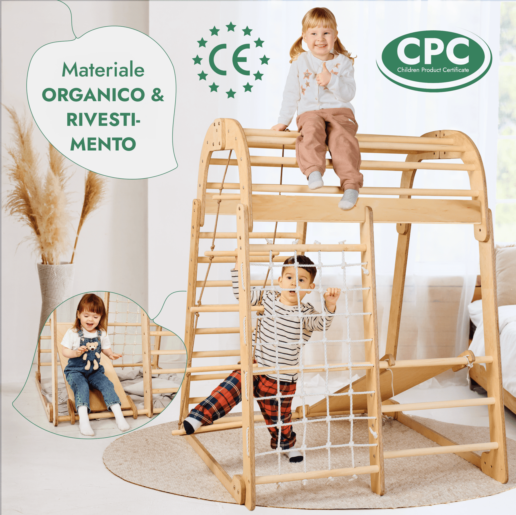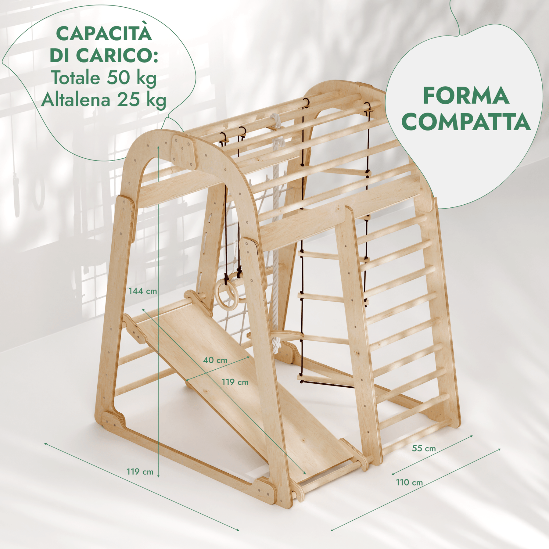 Onze multifunctionele kinderspeeltuin is ontworpen volgens het Montessori-principe en nodigt kinderen van 3 tot 8 jaar uit om actief te spelen, ontdekken en leren. Dit veelzijdige klimrek bevordert balans, coördinatie en motorische vaardigheden op een speelse manier – helemaal zonder schermen, maar met veel beweging en fantasie.