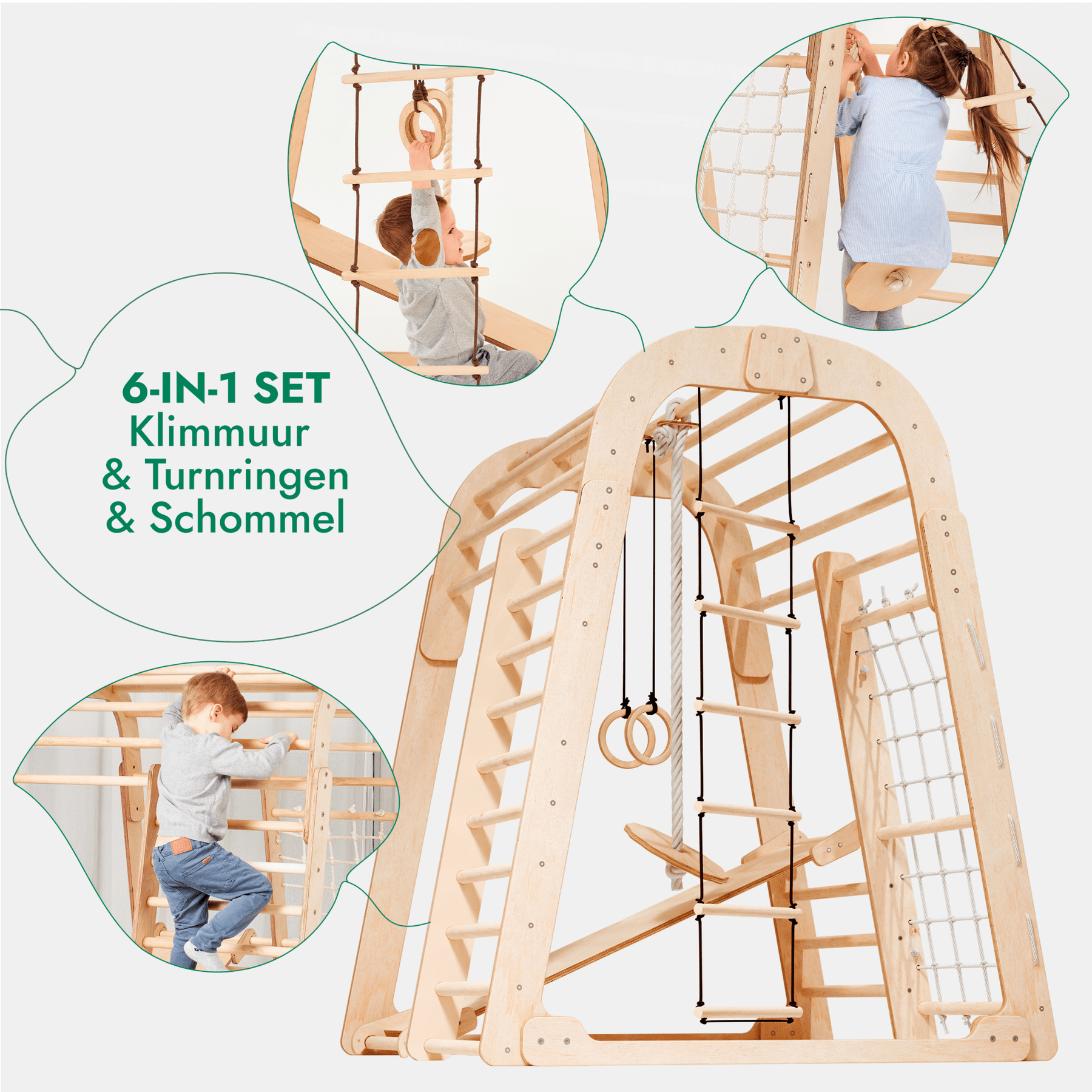 Deze speelset bevat een glijbaan, klimboog, turnringen, klimnet, touwladder en een Zweedse wand. Het helpt bij het ontwikkelen van kracht, behendigheid en coördinatie, terwijl het de wervelkolom van het kind versterkt. Perfect voor kinderen van 1 tot 7 jaar en stimuleert actief en veilig spelen.