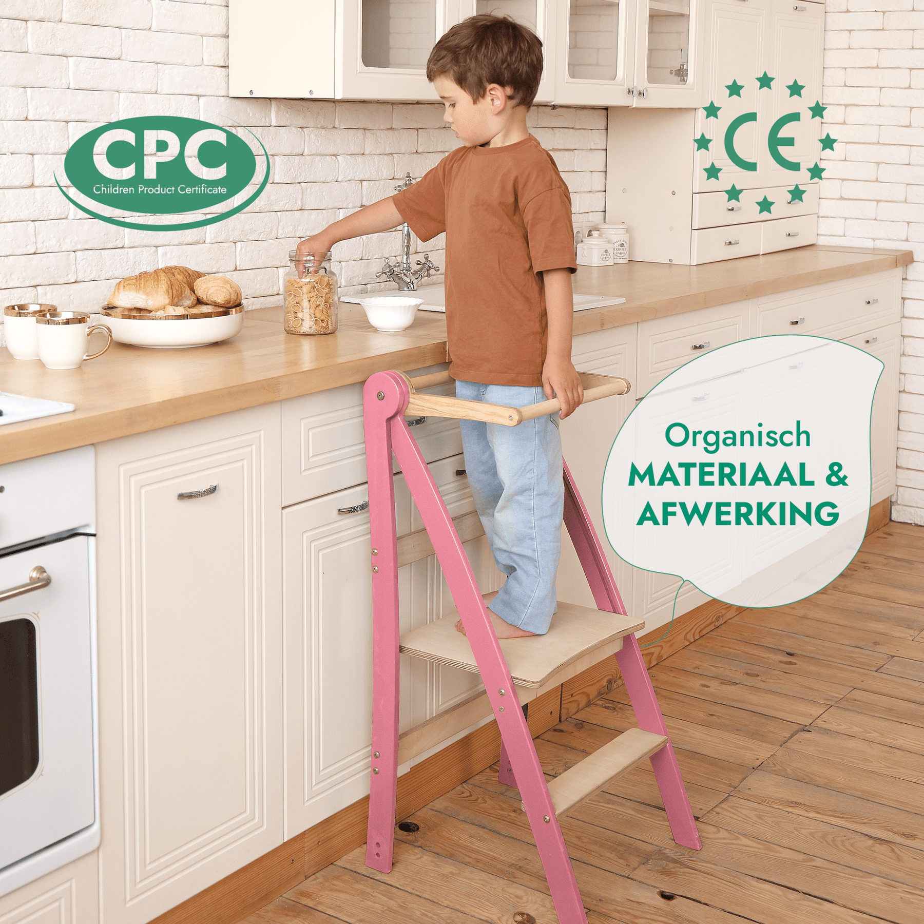 Laat uw kleintje met vertrouwen ontdekken, leren en groeien! Van het roeren en kneden van deeg tot snijden, scheiden, schenken en zelfs tanden poetsen of afwassen—dagelijkse taken worden leuk en leerzaam met de ondersteuning van onze opvouwbare peutertoren.